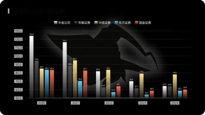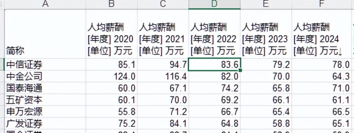 四年过去,降薪的效果肉眼可见,尤其是券商圈。以前的龙头中金,2020年人均年薪能拿到124万,到2024年直接跌到64.3万,2025年更是跌破60万,行业排名掉到了第五。