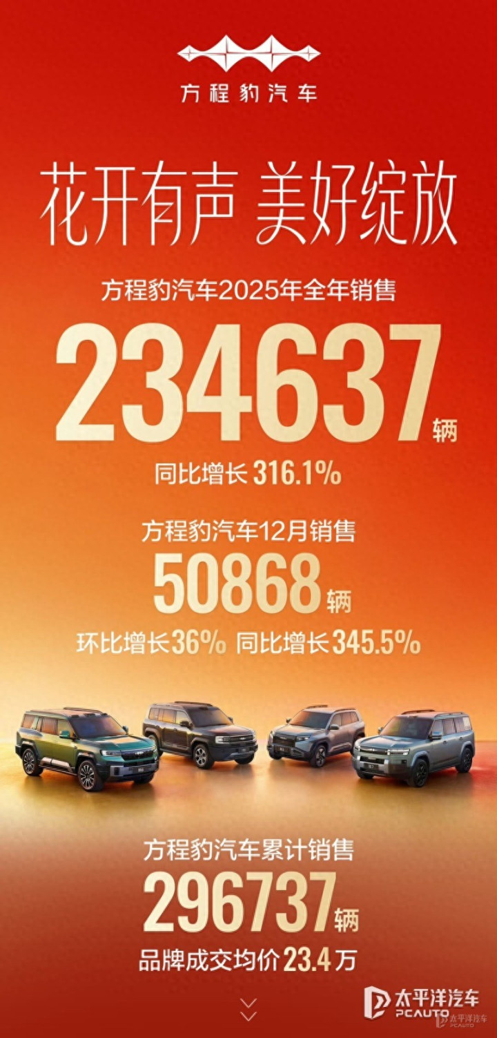 【太平洋汽车 行业频道】日前,方程豹汽车官方公布2025年12月及全年销量数据,12月交付新车50,866辆,环比增36%,同比增长345.5%,单月销量再创造厉害,突破5万辆大关,在新势力品牌里面位居前三。2025年全年累计销量234,637辆,同比增长316.1%,表现非常亮相。截止目前,方程豹汽车累计销量296,737辆,品牌成交均价为23.4万元。